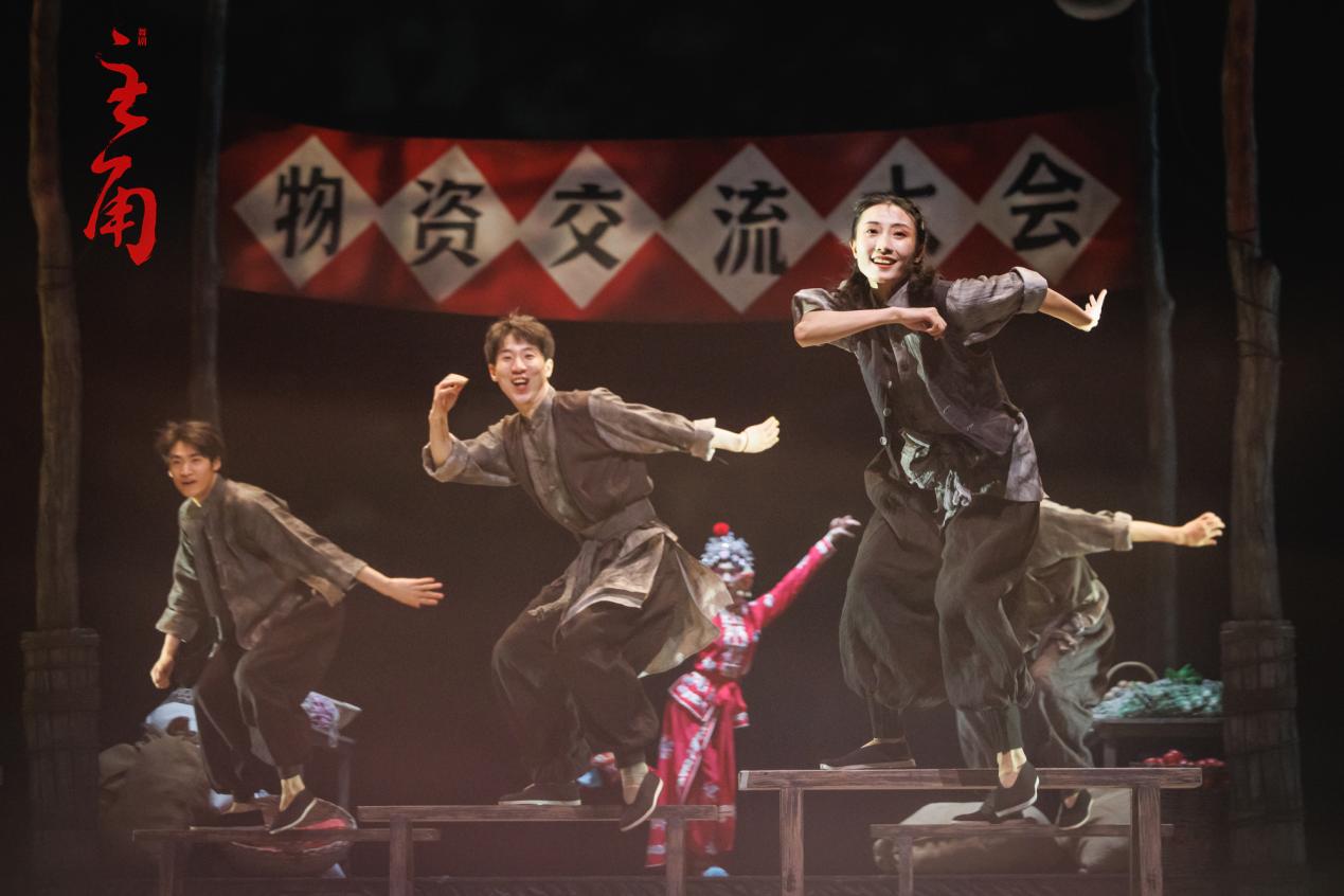 舞臺上那些藏有時代印記的細節——練功房斑駁的磚墻、幾張原木桌椅在追光下勾勒出茶館的煙火氣、四方畫框載滿的一場婚姻、一條“物資交流大會”的橫幅……這些元素碎片般散落舞臺,不喧賓奪主,卻悄然錨定劇情時空。
